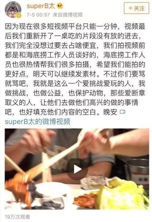 所以,真正的受益者,一个是海底捞,一个就是视频平台!不然的话,海底捞为何不发条微博谴责一下这个行为?视频平台为什么还给他通过审核呢?