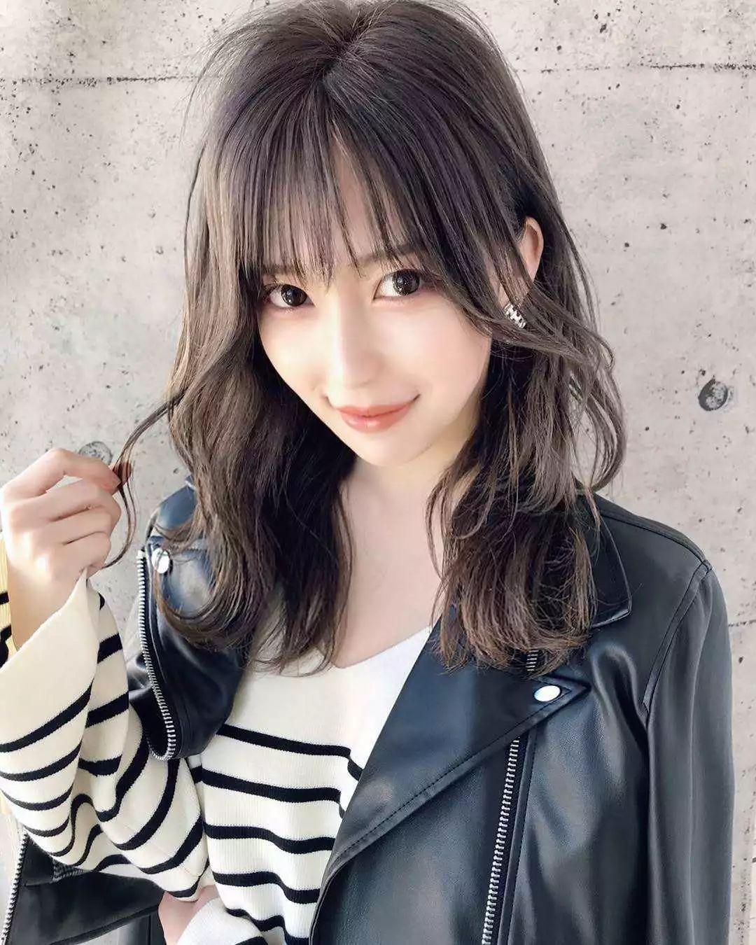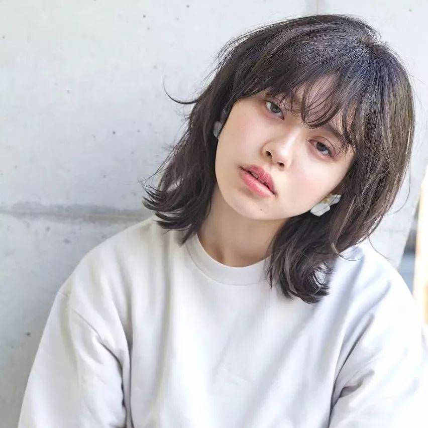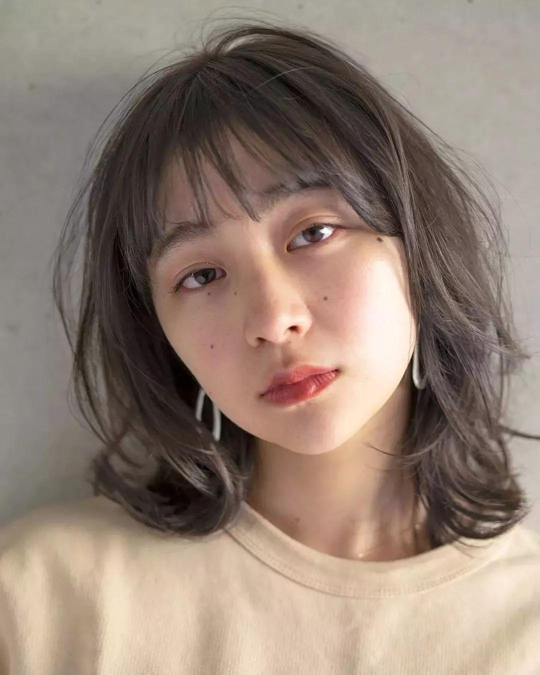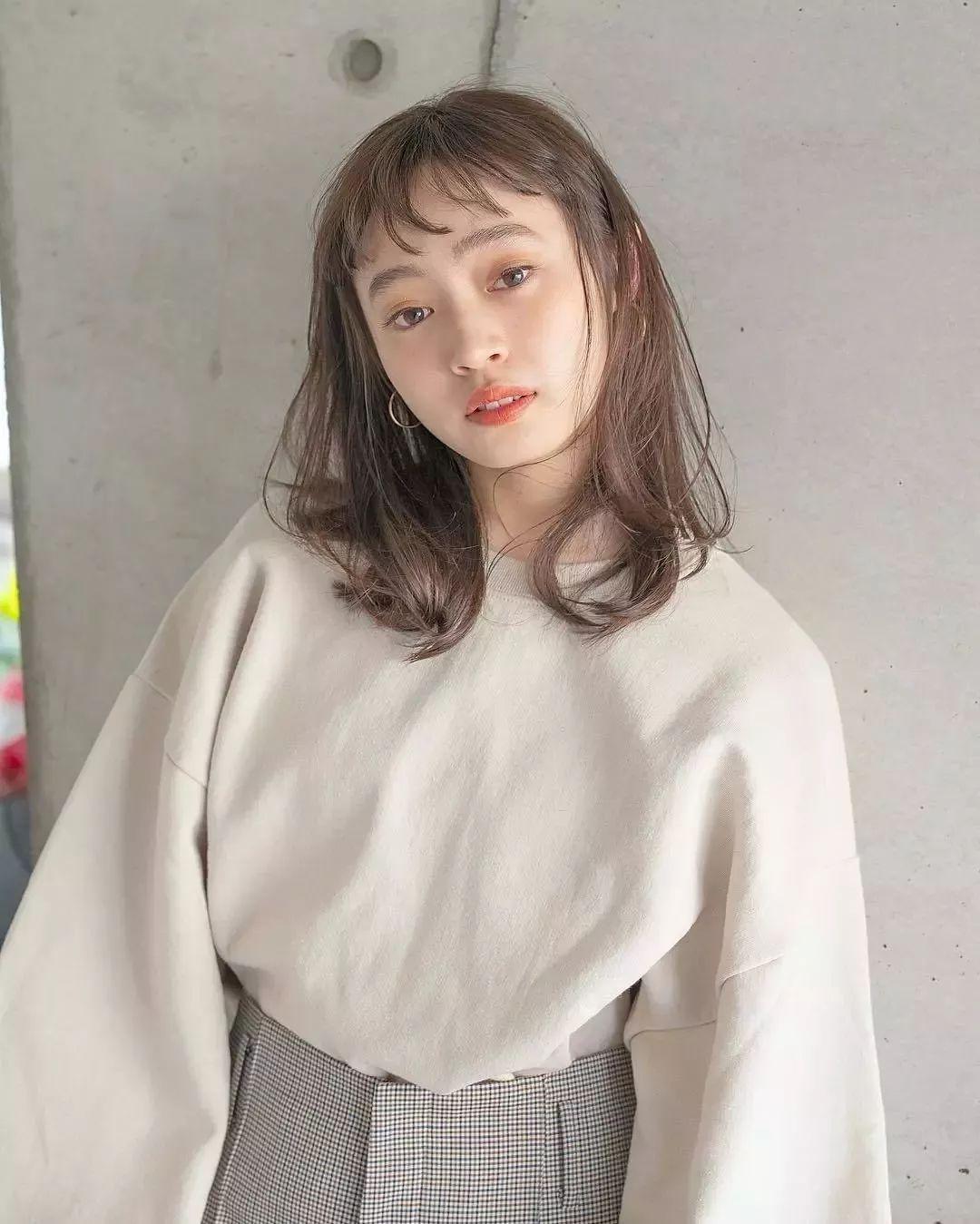 齐肩微卷搭配轻薄的刘海非常修颜,不会显得服帖,带点蓬松感的头发更适合发量少的妹子哦。