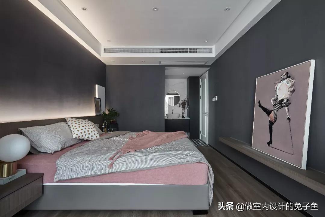 深灰色使用在主卧中,打造出的是利落、沉静的环境氛围,可作为装饰色局部使用,也可较大面积使用,搭配较鲜艳的饰品,或设置灯光能够在一定程度上缓解较大面积使用时略有的压抑感;但如果主卧面积较小或采光较差我认为不宜较大面积使用,因为深色会有一定的"缩小感",而且采光较差会让颜色"加深",所以卧室在视觉上会"更小",考虑在内。