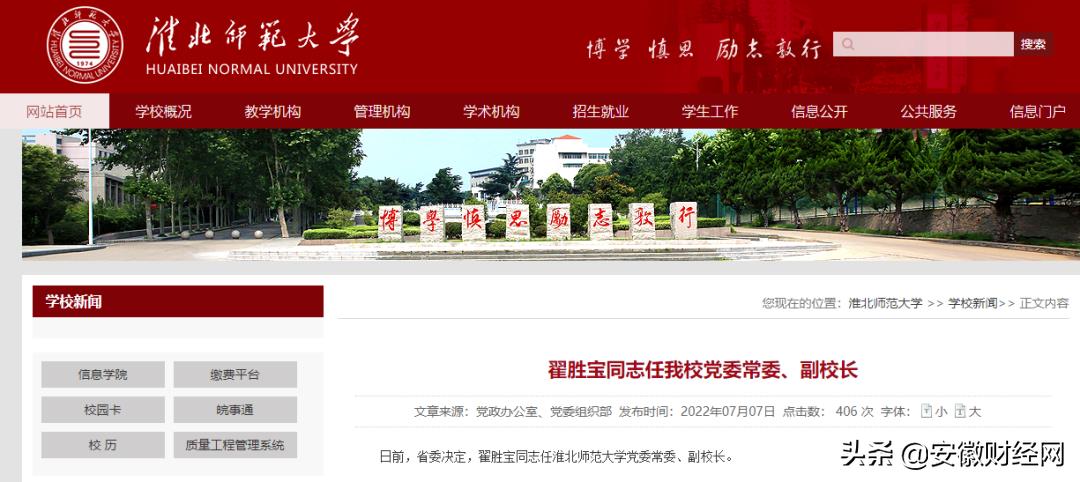 据淮北师范大学官网消息,日前,安徽省委决定,翟胜宝同志任淮北师范大学党委常委、副校长。