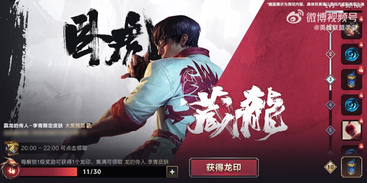 活动期间,每获取100经验,解锁1级“卧虎藏龙,新春挑战”活动等级,还能获得对应的活动奖励和一枚龙印。升到30级能够获得30枚龙印,就可以兑换“龙的传人 李青”皮肤啦!获得经验的方法有以下几种: