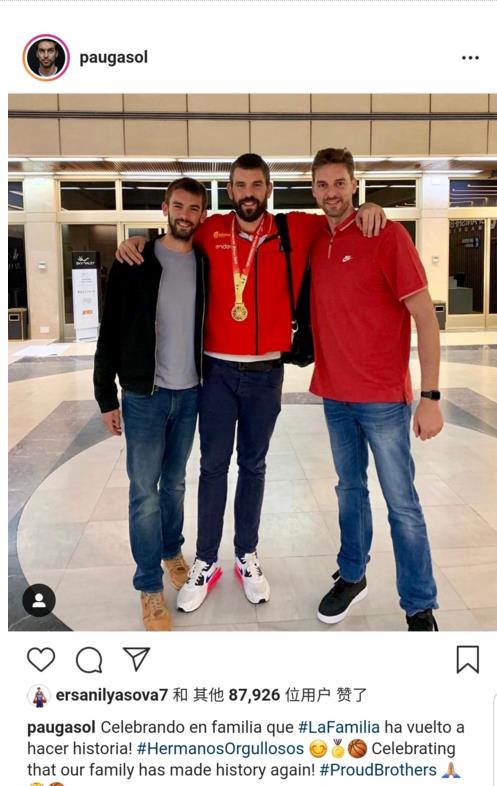保罗-加索尔晒出了与三弟一起在西班牙接机马克的照片,骄傲之情溢于言表,“一起庆祝我们家族再次创造了历史!”
