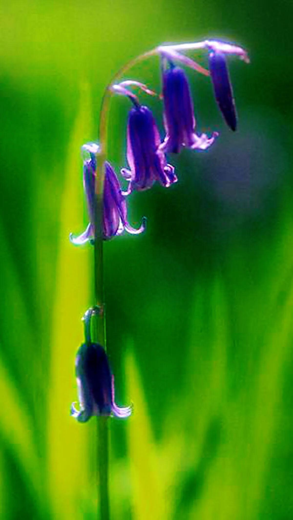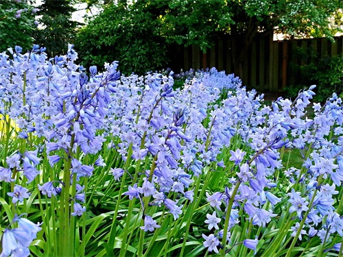 春天,蓝铃花开出一串串淡蓝色、淡紫色的铃状花朵,连成片的蓝铃花编织出美丽的蓝紫色花毯,朵朵花儿散发出清清的幽香,一阵风吹过来,一串串一排排花儿随风摇摆,微微地听到蓝铃花发出清脆的铃声,这是蓝铃花在告诉人们: