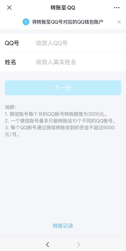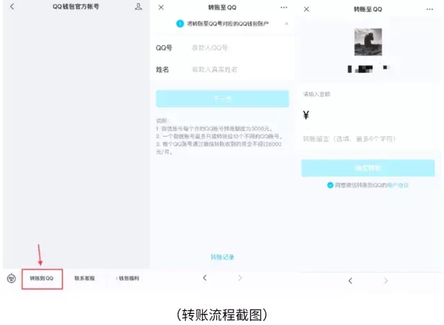 单笔转账金额不能超过1000元;每个微信号每个月转出金额的上限为3000元,最多只能给10个不同的QQ号转账;每个QQ号每个月转入金额上限为6000元。