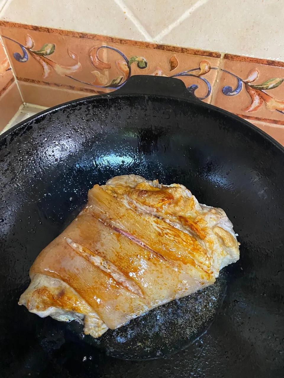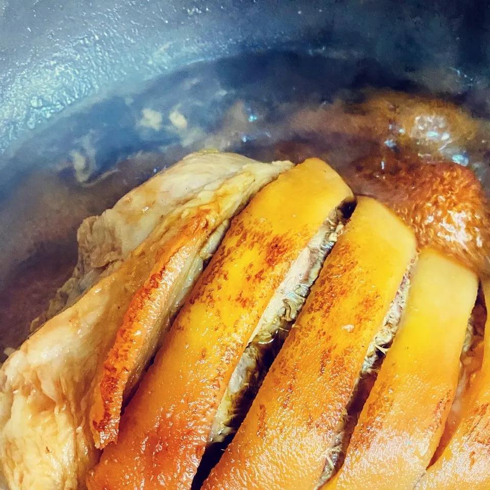 5.两面煎猪肘,小火,翻面上糖色,然后加入热水,水基本快没过猪肘