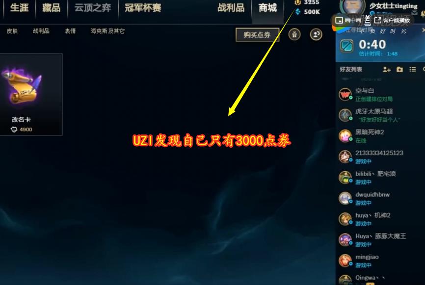 在最近直播的时候,作为职业选手的Uzi就使用的超级帐号,当时他是想要购买皮肤的,结果却发现账号里面只有3000多的点券,因此直接表示这完全不够用。不过好在他使用的就是第一种账号,因此在发现了点券不够用之后,直接给官方打了个电话过去,联系对方给他充点券,因为不是立马到账,所以说Uzi选择直接进了一把游戏。
