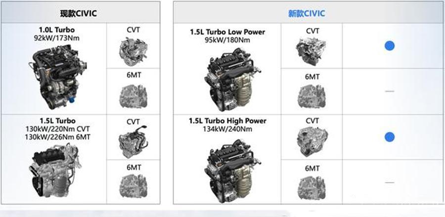 动力部分,全新思域取消了现款车型的1.0T三缸发动机,全系均搭载1.5T四缸发动机,分为高低功率版本,其中低功率版本的最大功率为95千瓦,峰值扭矩为180牛·米;高功率版本的最大功率为134千瓦,峰值扭矩为240牛·米,传动系统匹配6速手动或CVT变速箱。作为参考,现款思域1.0T版本的最大功率为92千瓦,1.5T版本的最大功率为130千瓦。