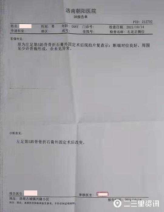 10月18日,洛南县一老太太向华商报-二三里资讯反映称,她的孙子今年6岁,在洛南县古城镇寺坡九年制青瓷学校上一年级。9月30日14时许,课间休息时,孩子被两个同班同学强行拉扯到操场一边的高台处,然后一名学生从背后推下,导致孩子左脚第5跖骨骨折。孩子受伤后,由于国庆节假期,她先自行带孩子看病。“推我娃的学生家长,给了几百块钱医药费后说我娃是自己摔的,现在不管这事了。”老太太说,“我原来每天打工,现在要每天照顾娃,导致没有生活来源。”