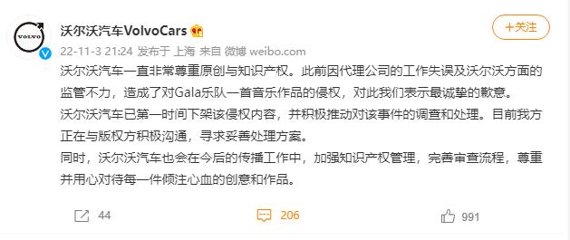 沃尔沃汽车一直非常尊重原创与知识产权。此前因代理公司的工作失误及沃尔沃方面的监管不力,造成了对Gala乐队一首音乐作品的侵权,对此我们表示最诚挚的歉意。