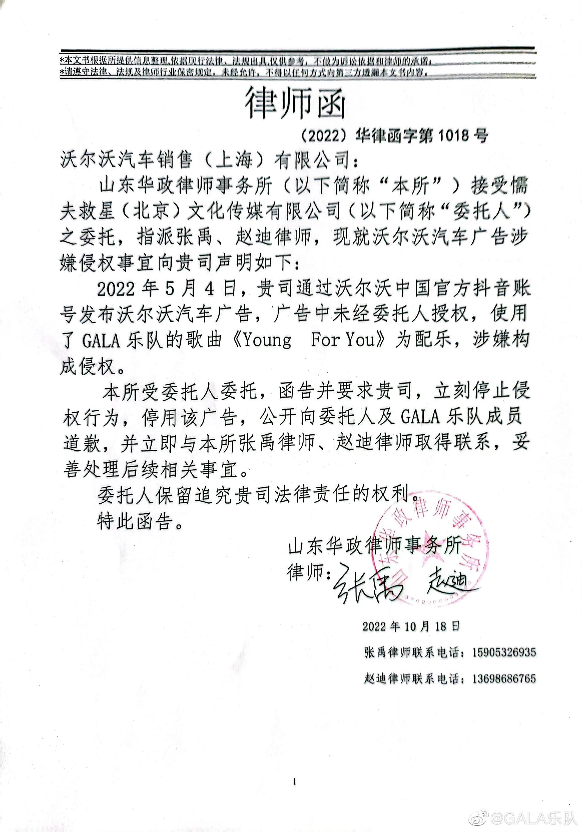 10月18日,GALA乐队曾在微博发布一封律师函,称沃尔沃中国官方抖音账号于2022年5月4日发布的一则沃尔沃汽车广告中,未经委托人授权使用了GALA乐队的歌曲《Young For You》为配乐,涉嫌构成侵权。