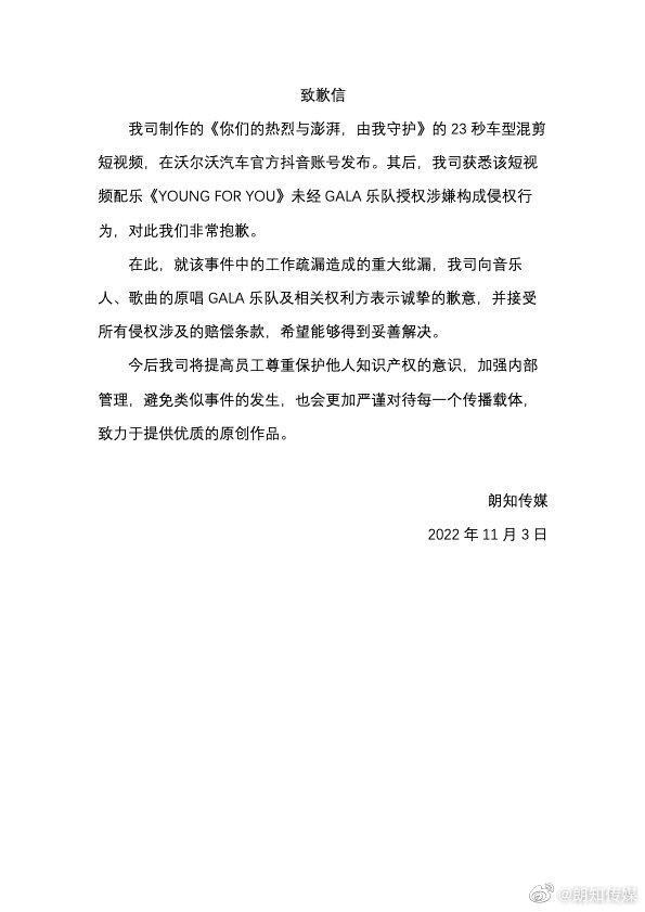 11月3日晚,沃尔沃汽车在官方微博针对广告侵权GALA乐队一事致歉。