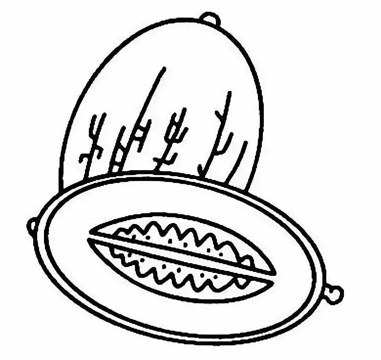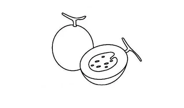 接着在被切开一半的哈密瓜旁边画一颗完整的哈密瓜,一个竖起来的椭圆形,右下角的一部分因为被一半哈密瓜挡住了,所以对应完整的哈密瓜椭圆形状要擦掉一部分。同样完整的哈密瓜也要画上柄。