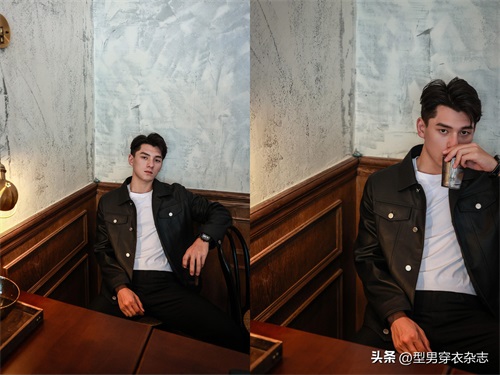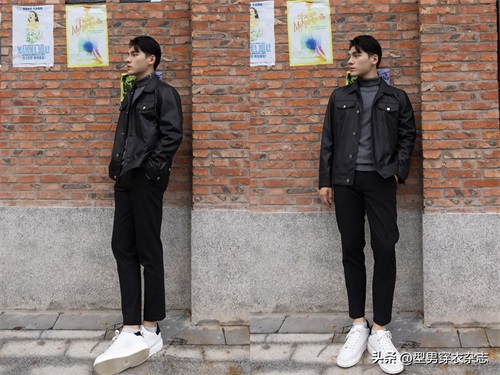 和黑色皮衣一样,搭配白色圆领T就很出彩,想要再休闲舒适一点,搭配深色休闲裤和白色板鞋,一身造型既有趣味,又活力十足,整一个少年感上身!
