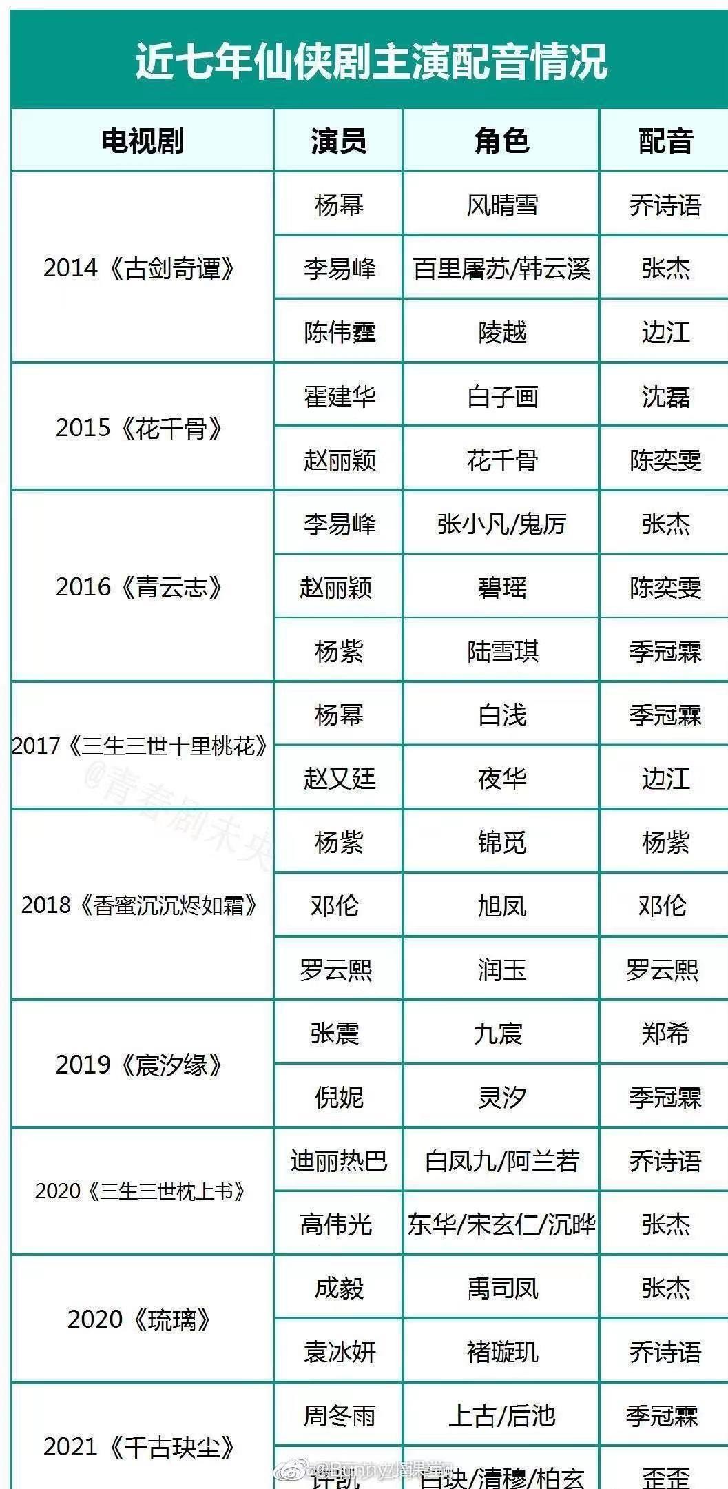 目前网友统计了几部近年大热的仙侠剧,基本上都是配音演员季冠霖、边江和张杰等人配音,剧播出之后大火,与他们精彩的配音不无关系。