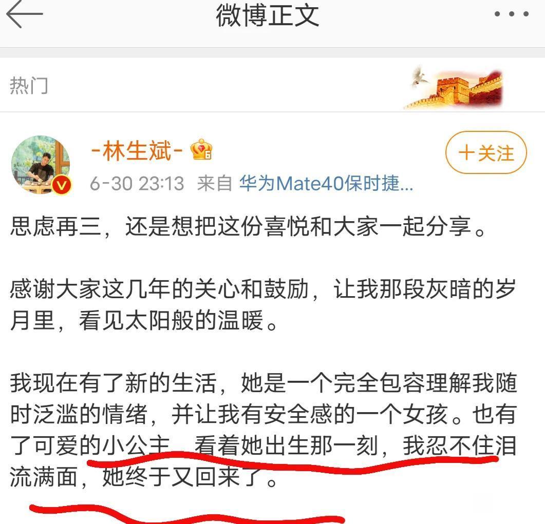 而在七一前半个小时,这个社会新闻娱乐新闻通通都要让步的日子,这个负面新闻绝对上不了热搜的日子,林先生向大家宣布自己喜得爱女,并表示“她终于又回来了”。