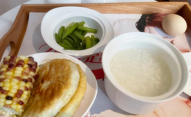煮鸡蛋+炒菜梗+馅饼+煮玉米+白粥