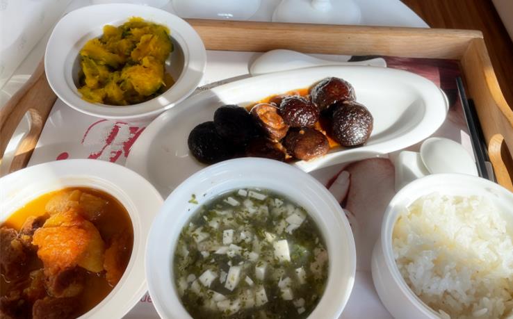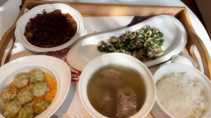 海鲜菇炒青菜+土豆炖羊肉卷+清蒸鱼+鸽子汤+黑豆饭