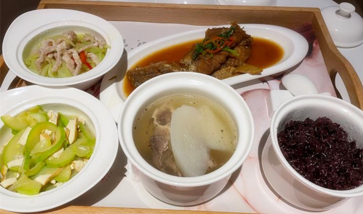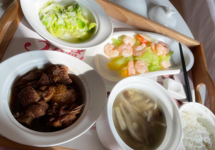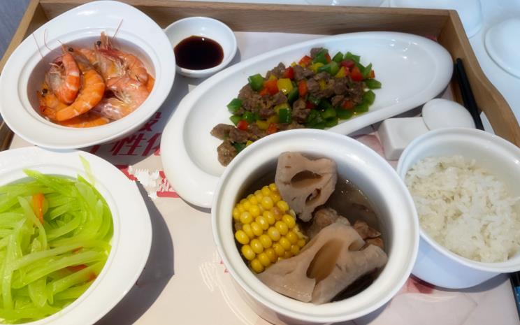 虾仁炒青笋+炒青菜+猪肚汤+炖老鸡