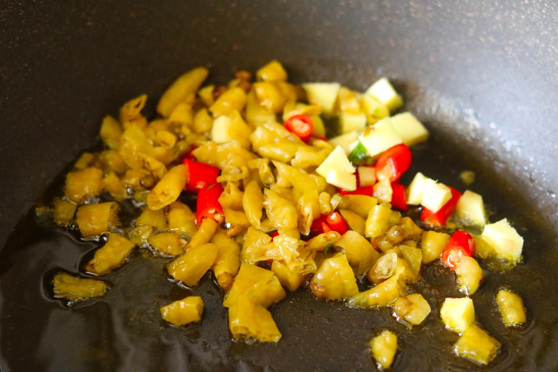 3、锅中放入菜籽油,把它烧热,放入小米辣还有泡椒把它炒香,再把姜丁放进去炒,放入豆瓣酱半勺炒出红油。