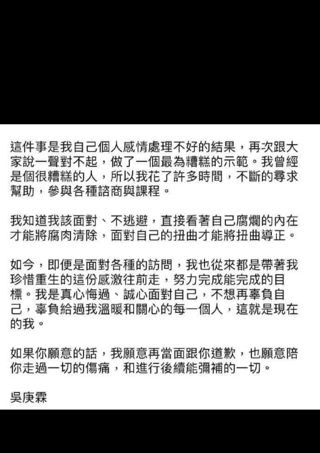 这件事是我自己个人感情处理不好的结果,再次跟大家说一声对不起,做了一个最为糟糕的示范。我曾经是个很糟糕的人,所以我花了许多时间,不断的寻求帮助,参与各种咨商与课程。