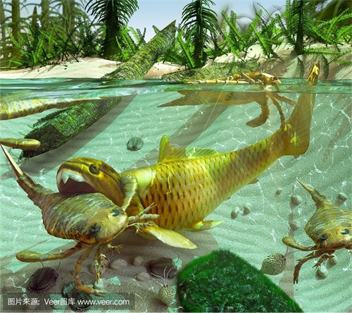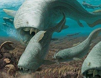 距今约3.64亿年,地球可能出现了一次冰期,海洋生物遭到重创,82%的海洋物种灭绝。鱼类在这次生物大灭绝后发展壮大,很快成为海洋的霸主。现在的鱼类只有三个分支:硬骨鱼、软骨鱼、圆口鱼。而泥盆纪时还有另外两种:头甲鱼和盾皮鱼,其中盾皮鱼是海洋的主宰者。有一种盾皮鱼叫做邓氏鱼,是海洋中的顶级掠食者。邓氏鱼身长10米,体重30吨,咬合力达3000千克每立方米,足以将钢筋咬得粉碎,这样的咬合力只有巨齿鲨能与之匹敌。