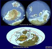 泥盆纪是古生代的第四个纪,距今约4-3.6亿年,延续时间约4000万年。“泥盆”(Devon)一词来源于英国英格兰西南半岛上的一个郡名(Devonshire,德文郡)。泥盆纪时月球和地球之间的距离大约是现今的一半。每年平均400天,每昼夜约为21~22小时。