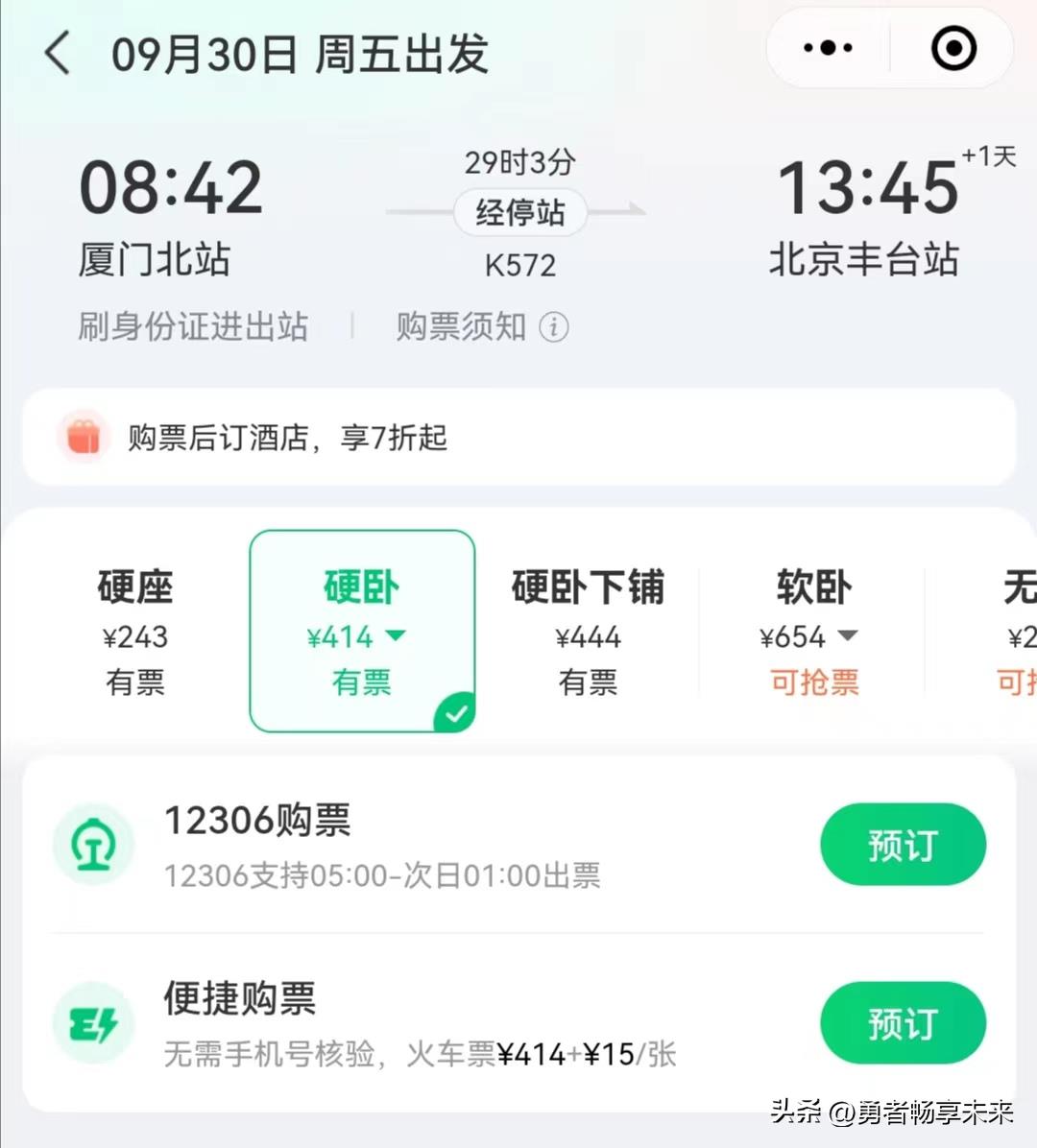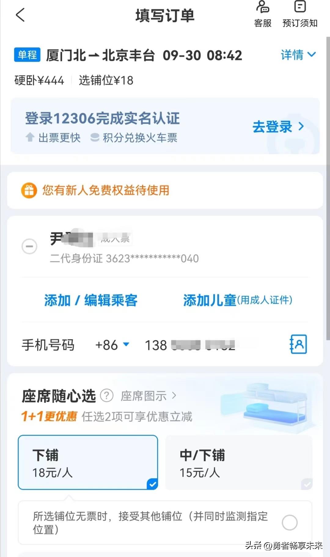 以在高铁管家购票为例,厦门到北京K572,未注册12306账号的用户购票需加20元/张