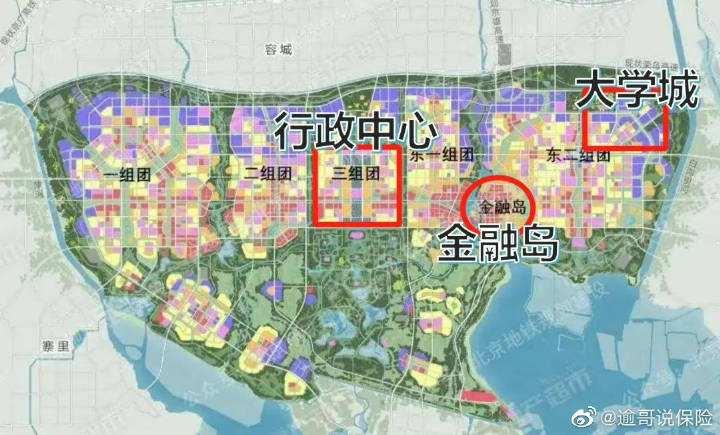 首先看雄安新区规划图:面水而建,形如心形,中间是行政中心,东北角是大学城。