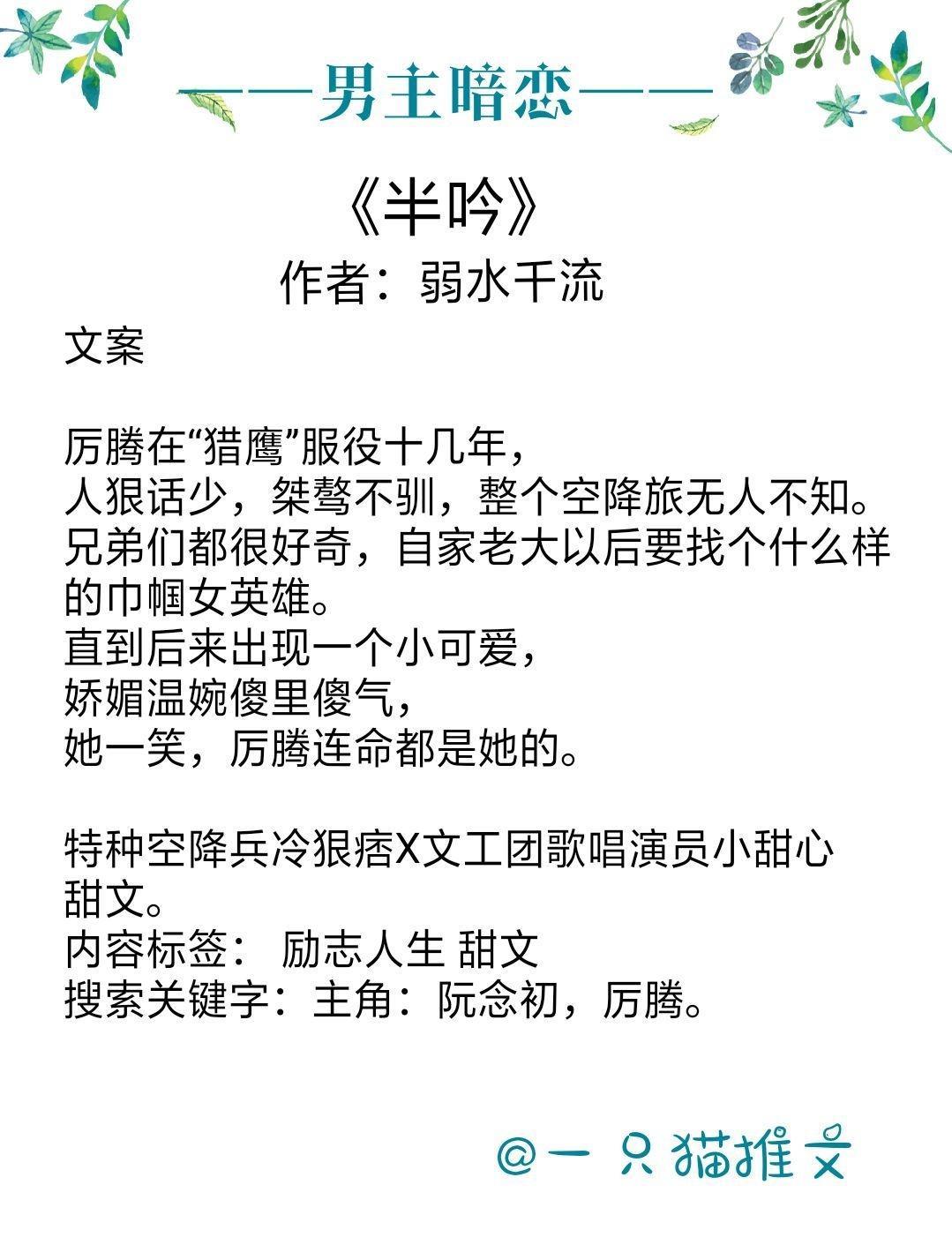 这本是现实向文,男女主都是很接地气的普通人,人设很真实,女主曾经光芒万丈小公主,后来落魄了,男主开军用飞机的,小时候土帅土帅的。长大以后两人相遇一个教师一个军人。男女主性格都比较拧巴,女主作起来,脾气差得不要不要的,还很喜欢把怨气发泄给无辜的男主。但是爱她就会包容她的任性和无理取闹,男主就是这样,从小就爱上了,一眼万年,也是感觉很甜,慕了5《半吟》