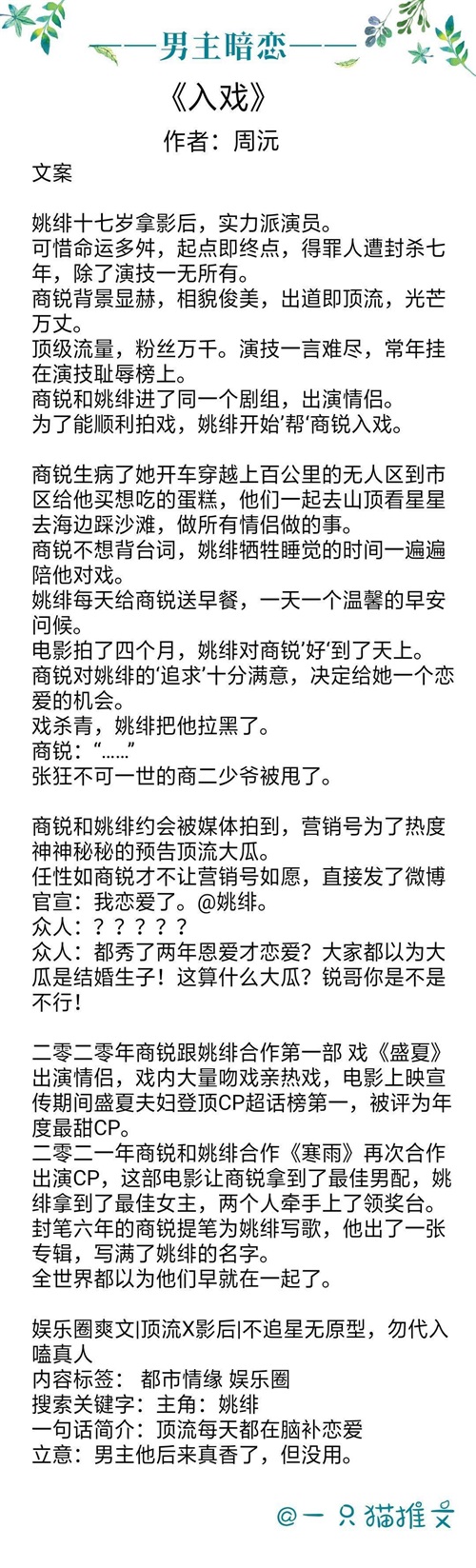 男主太可了,毒舌见表能力满级,怀着暗恋当新郎,迅速套路女主领证,坐实名分,然后那个结婚证每天都随身带着笑死了,男主真的是超级守男德,求生欲极强。就是甜甜的婚后恋爱,感情戏没什么阻碍,书荒看吧,我当时看它全靠同期其他完结文的衬托。8《入戏》