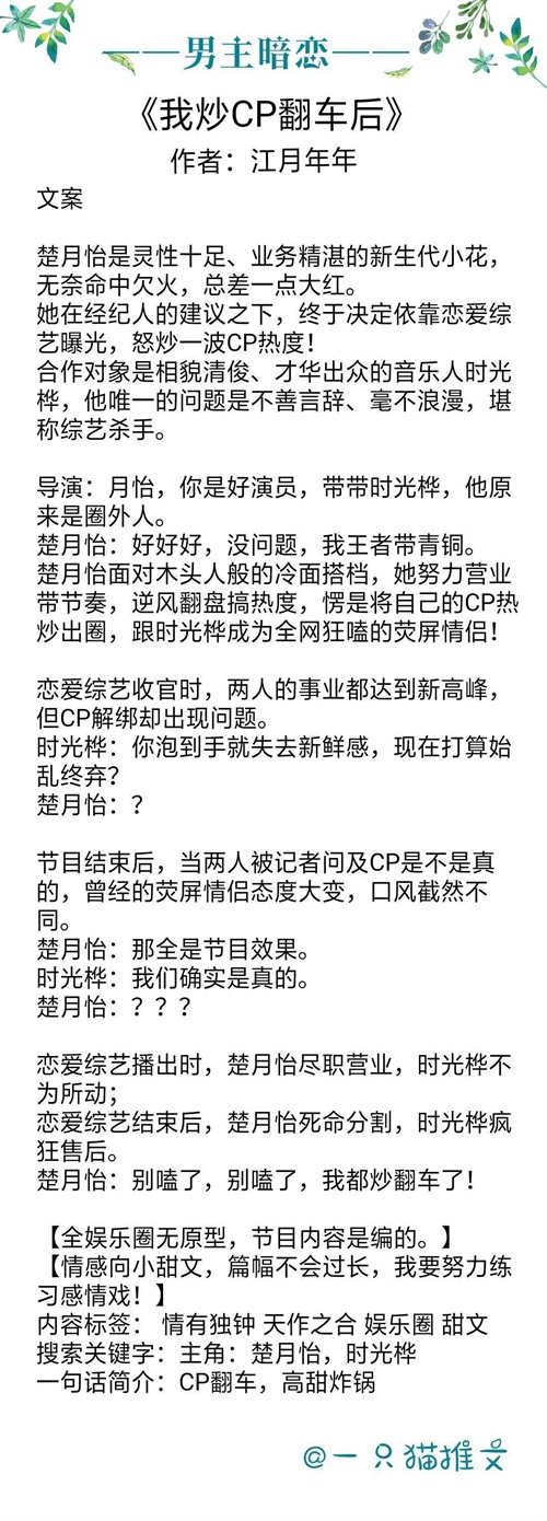 开篇就是女主当志愿者去柬埔寨支教,结果被武装犯罪分子绑架了,就在她差点要被男人侮辱的时候,男主出现救了她。男主出场的方式就像一个反派头目,手上全是纹身高大挺拔气势逼人,但其实他是军方卧底。救下女主后,他就把女主留在自己身边,做他的女人。后面两个人在柬埔寨相处的这段时光真的好甜呐!女主长得很漂亮,性格又可爱,而且笑起来太好看,男主其实对女主一见钟情。女主被绑架的第21天成功获救,男主也端了犯罪分子的老巢,然后两人分开没有交集,七年后再次重逢。从他们重逢开始,两个人就频频偶遇,后来还意外地成为了相亲对象。但是这世界上哪有那么多久别重逢呢?不过是其中一个人处心积虑罢了。男主自从七年前一别就对女主念念不忘,重逢后遇到女主在相亲,他就控制不住自己的心魔,开始制造偶遇。男主人设真的绝,年轻有为,成熟稳重,虽然高冷话少,但是却很浪漫,这个男人真的很浪漫。在柬埔寨的时候,男主就每天托孩子送一束花给女主,好在女主在快走的时候也知道了那花其实是男主送的。有次男主受伤昏迷发烧了,女主照顾他。他迷迷糊糊喊女主的名字,然后问她,你到底知不知道你笑起来很好看。还有次撞见女主在洗澡,他不小心看到了那美妙的一幕,然后惦记了那副身子七年。嗷~真的很甜!后面就是七年后的重逢、女主作为文工团的歌唱演员遇到男主、两人相亲,顺理成章地成为男女朋友,然后就是开始撒糖!6《我炒CP翻车后》