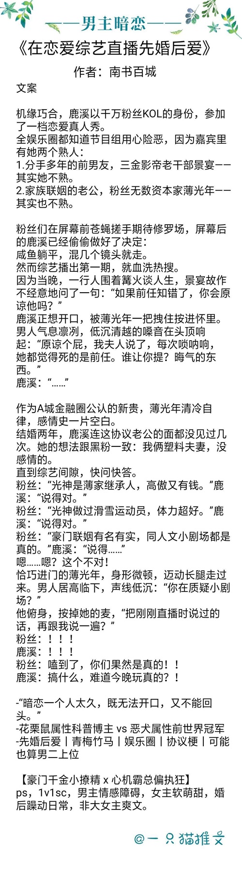 这本看书名是娱乐圈文,但其实是双总裁联姻先婚后爱,男主暗恋。因为女主本身家里有钱,又曾是知名短视频博主,后来转型开公司,男主也是总裁。