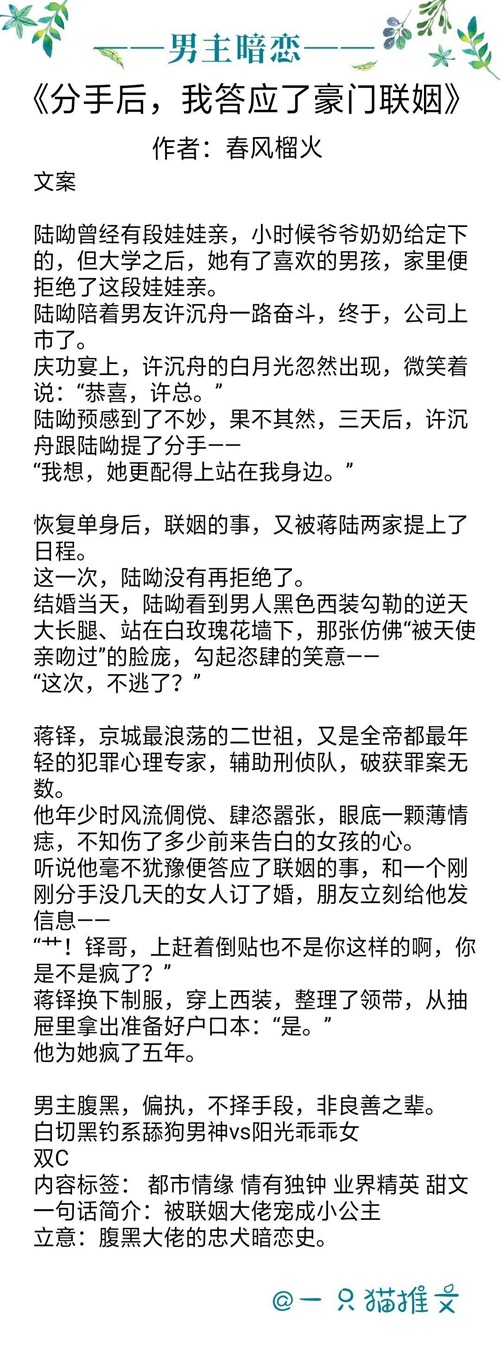 两人的联姻协议里面有定期关注对方的生活圈子,所以两个人婚后互动虽然平淡,但是细水流长超级甜。比如女主还得在男主的要求下定闹钟,定时收看财经新闻哈哈哈,男主给定6点半看,女主求了半天往后拖半小时,男主出差后,女主就直接9点看[笑哭]。或者女主趁着老公不在家,出去玩剧本杀还敢打喝酒本啥的,被抓个正着。女主早上10点求男主一起上节目,男主毒舌问你们公司10点还没有事做,离倒闭也不远了吧。女主有事所求就是喊男主亲亲老公,先婚后爱就是坠甜的!2《分手后,我答应了豪门联姻》