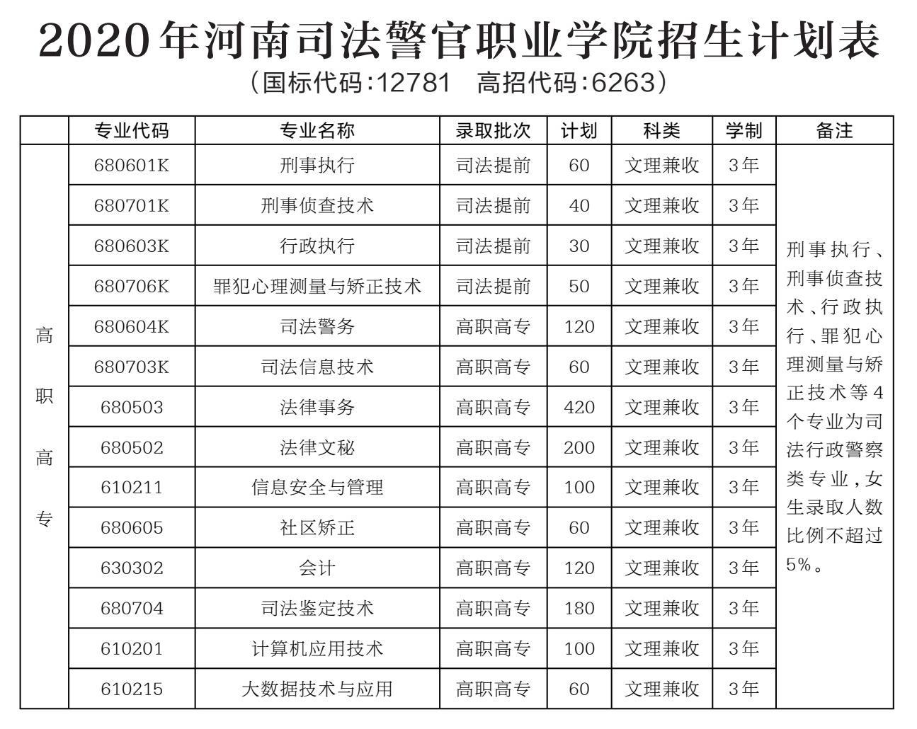 河南司法警官职业学院,前身为河南省劳改警察学校、河南省司法警官学校,1985 年建校,2001 年 4 月经河南省人民政府批准升格为河南司法警官职业学院。学院隶属于河南省司法厅,业务受省教育厅指导,是以高等司法警官教育为主,多种专业教育并举,培养应用型、复合型人才的全日制警察类普通高等学校。设置有监所管理系、法律系、信息技术系、警察学系、司法行政管理系、基础部、思政部、警体部、警察技术实验中心等教学机构,开设有刑事执行、刑事侦查技术、行政执行、罪犯心理测量与矫正技术、司法警务、司法信息技术、法律事务、法律文秘、信息安全与管理、社区矫正、会计、司法鉴定技术、计算机应用技术、大数据技术与应用等17个专业。其中刑事执行、刑事侦查技术、行政执行、罪犯心理测量与矫正技术、司法警务、司法信息技术等 6个专业为国控专业。有普通高职和五年一贯制专科办学层次,在校生 8700余人。