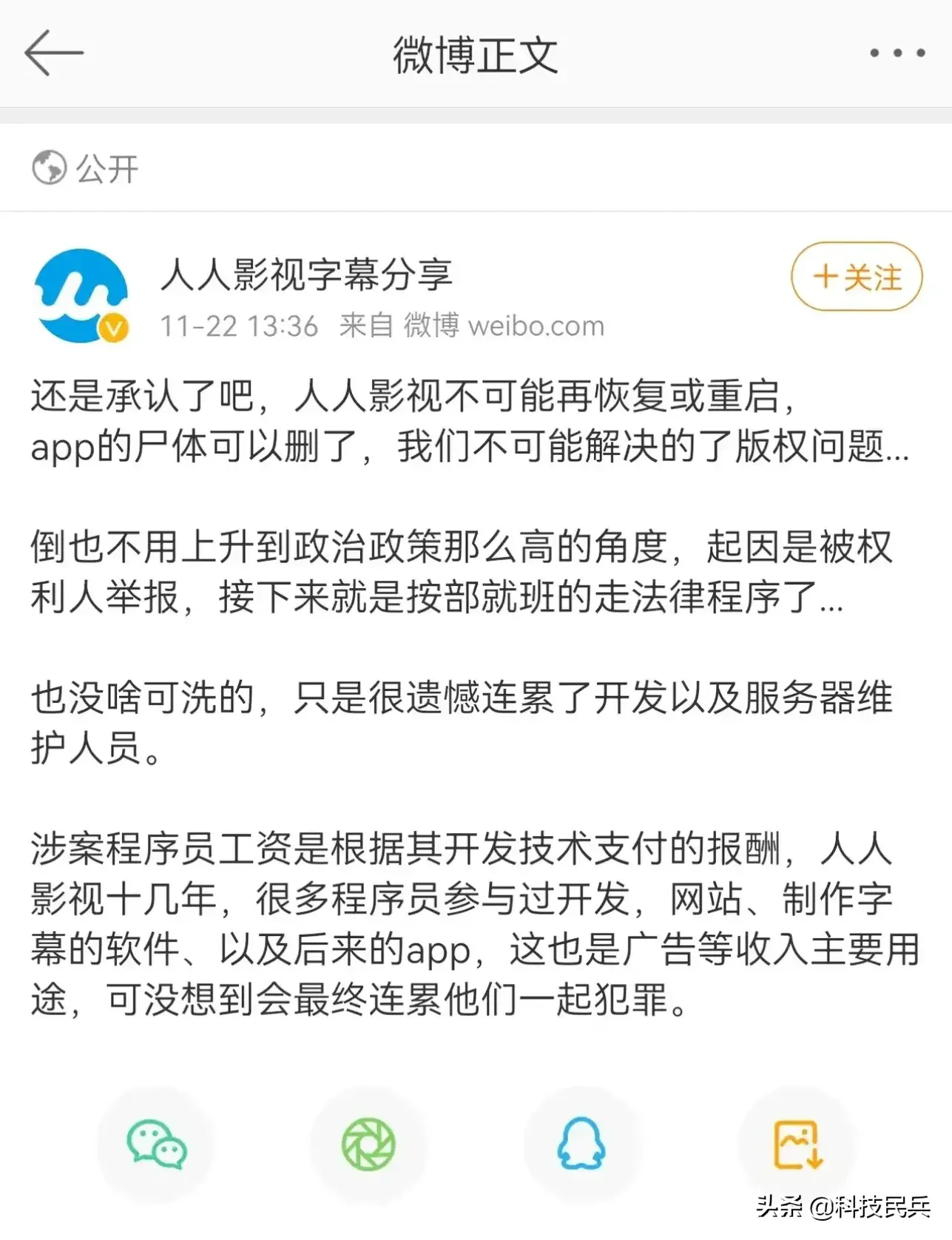 就在几天之前,人人影视字幕组创始人梁永平因为涉嫌侵犯著作权被正式宣判,跟当年的快播王欣一样,被判了3年6个月,人人影视字幕组的官方账号也坦承,“人人影视不可能再恢复或重启”。
