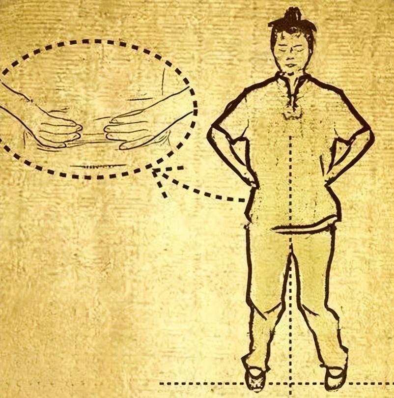身体直立,两手自然扶住腰部的肾腧穴。沉肩挺胸,闭目自然呼吸。舌顶上鄂口微闭,下颌微收。左脚缓慢抬起,向左侧迈一步,与肩同宽,两脚间自然呈内八字,两膝微屈,同时汇集意念至头顶百会穴。静站10分钟。