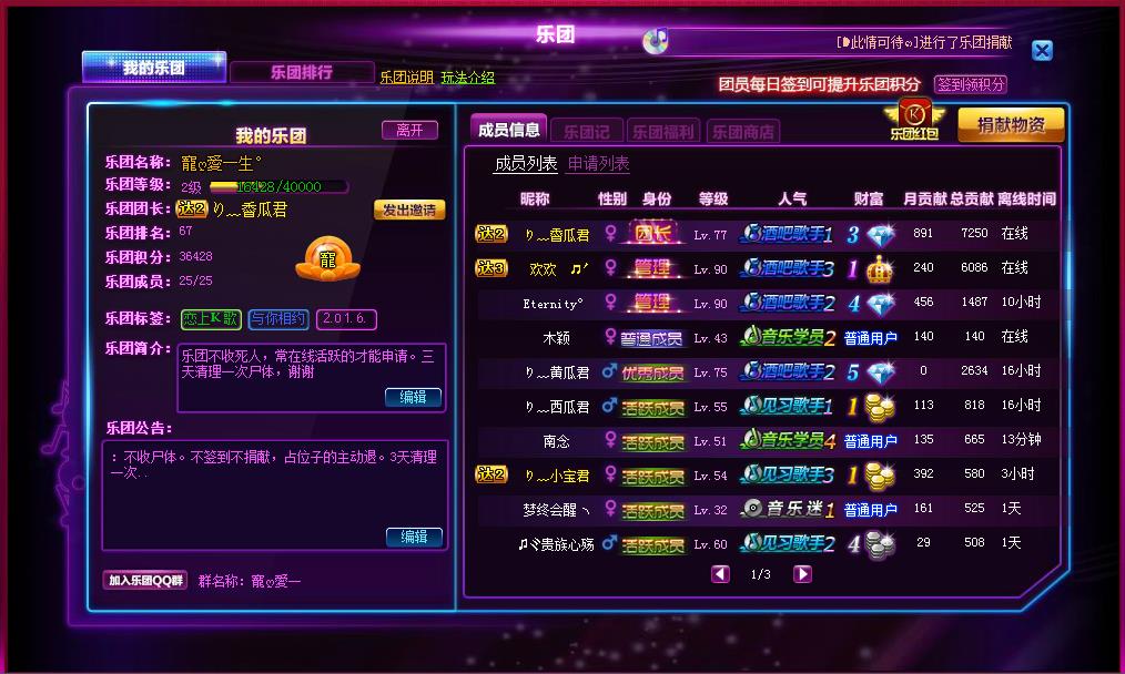 玩家可以选择自己喜欢的乐团加入,和乐团好友一起欢乐唱K。也可以自己创立乐团,打造一支专属于自己的K唱团队。乐团成员可以捐献物资、点券以及发红包等,增加乐团积分,为自己的乐团做贡献。同时还可以领取乐团福利,在乐团商店购买商品。
