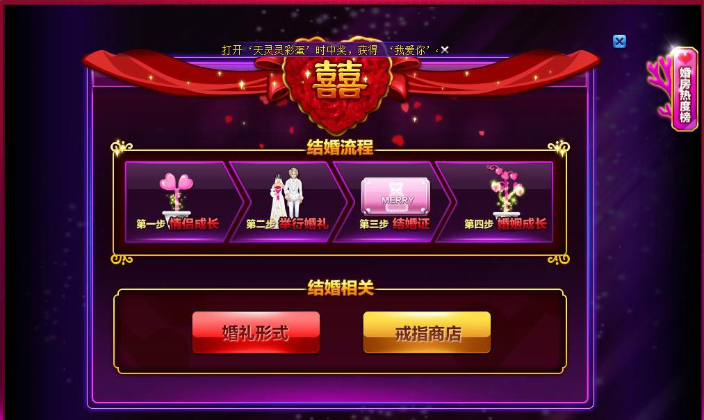 玩家结婚后在游戏内唱歌/听歌会增加心动值,心动值成长后会开启更多辅助系统:个人信息面板升级、特殊情侣装升级、对戒镶嵌升级等。