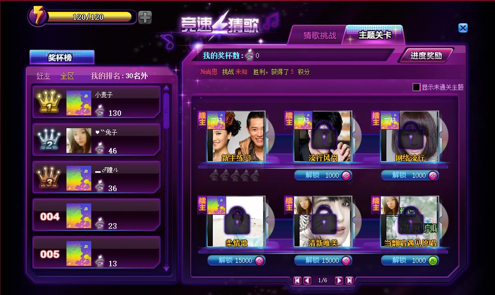 玩家可以在游戏中心选择“竞速猜歌”体验全新的猜歌玩法,猜歌系统一共分为2部分“猜歌挑战”和“主题关卡”,参与“猜歌挑战”的玩家可以选择好友或者在线玩家进行PVP挑战,获得积分,兑换奖品。
