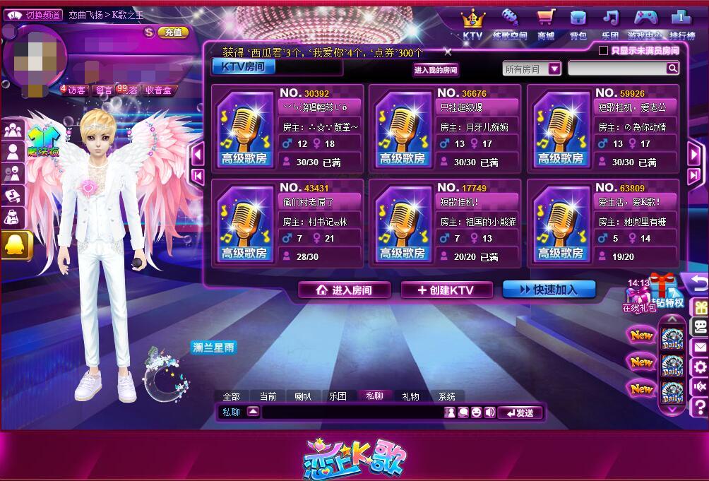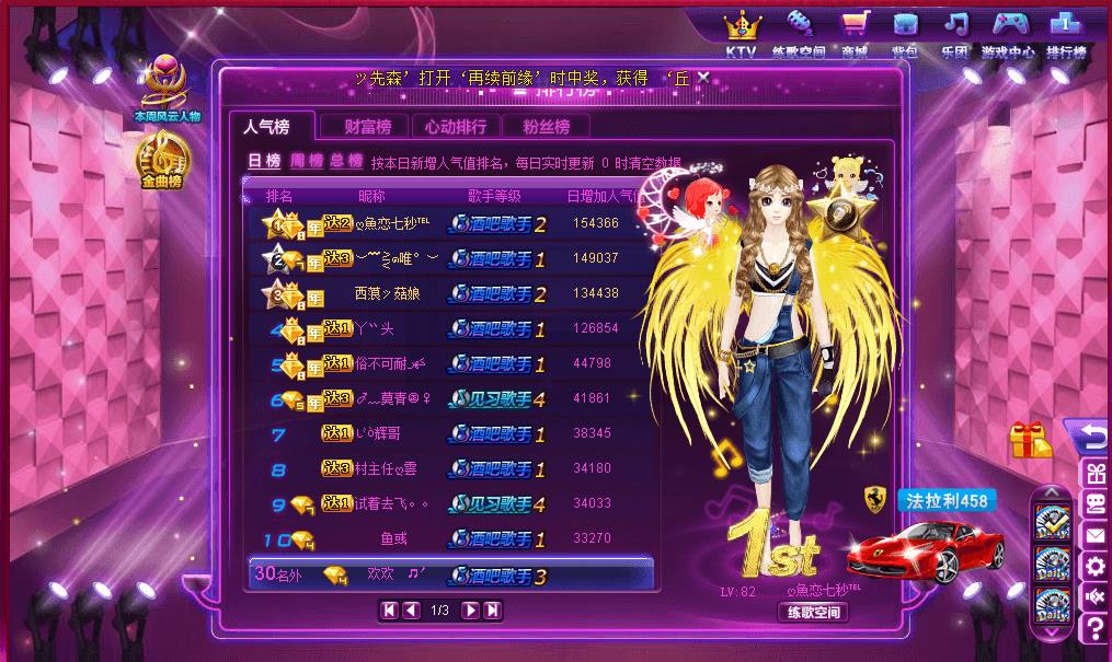 获得人气值:只有在KTV房间唱歌中演唱时,获得其它玩家赠送的礼物道具才能增加自己的人气值,提升歌手等级。