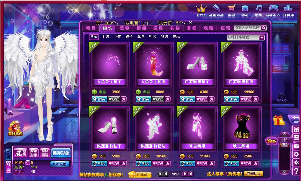 商城是玩家装饰人物形象,购买服装饰品、礼物及游戏道具的场所。