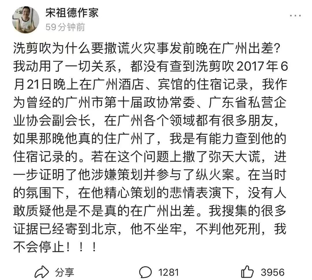 正义感爆棚的宋祖德公开发文,称他动用一切关系查询2017年6月21日事发当晚林生斌是否如他所言在广州,查询结果证明林生斌撒了弥天大谎。宋祖德称已将搜集的很多证据寄到北京,“他不坐牢,不判他死刑,我不会停止”。
