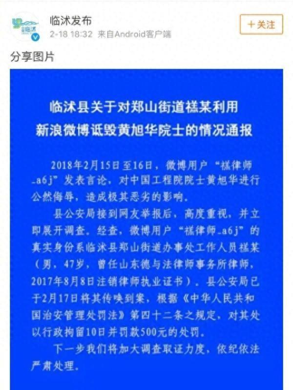 临沭公安对侮辱黄旭华当事人处以行拘10日,并罚款500